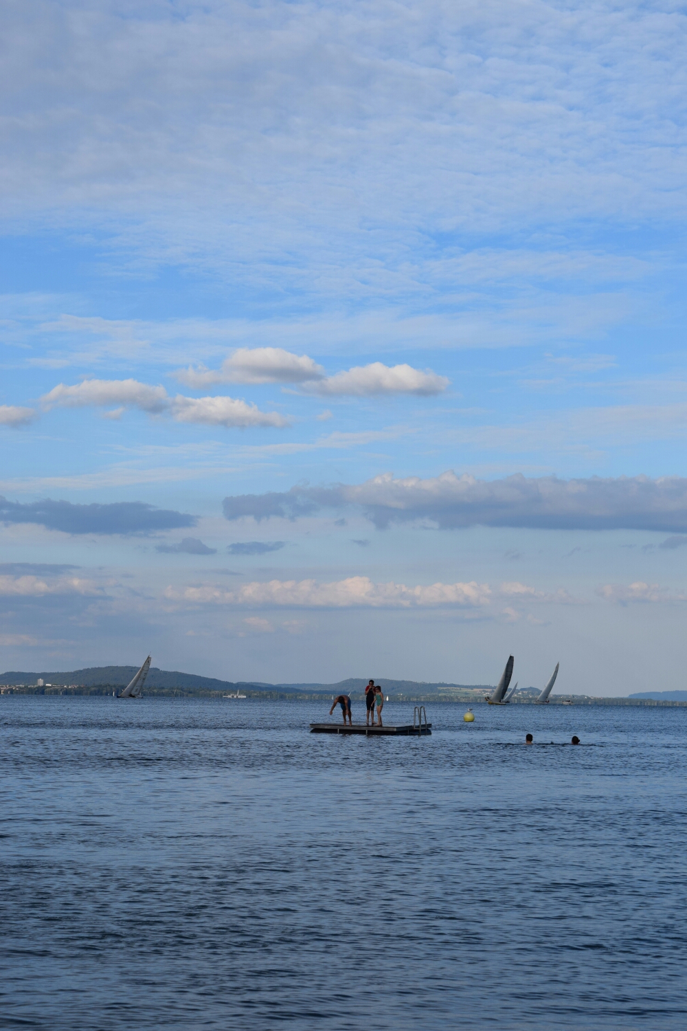Half an hour later the tent was up and pitched as far from the motorway as we could get it. It was now the moment to see in this plage was really paradise. We went through a small forest to get to the pebbly beach. Wow to our amazement it was beautiful and clean beach with water as clean as the day and a warm Swiss afternoon sun beaming down on us. After a about an hour of sun bathing and swimming out and back to the pontoon it was about time for bed.